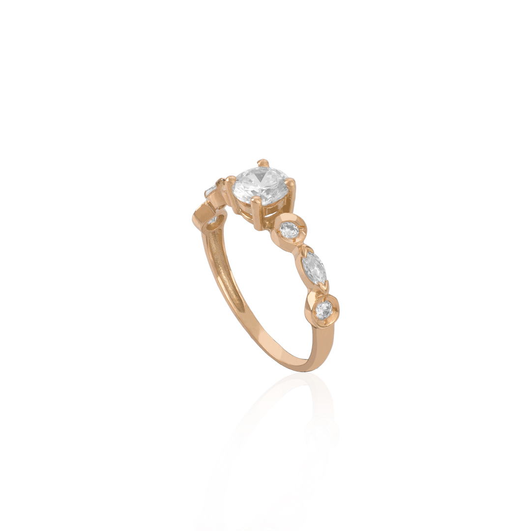Anel com 1 zircónias de 5.0mm ao centro, 4 2.0mm e 2 em forma Navete de 4mm x 2mm.